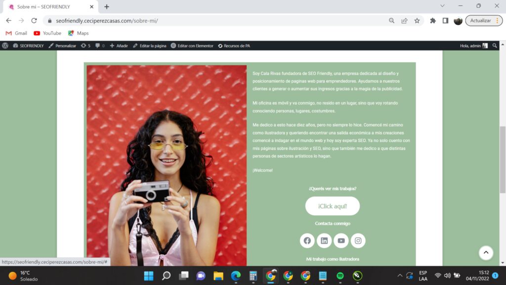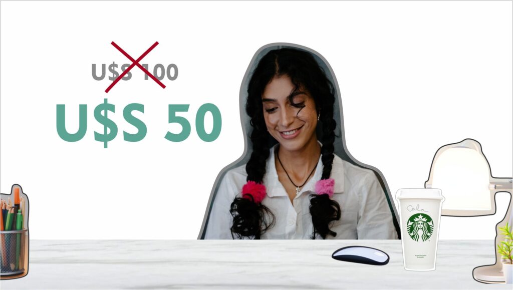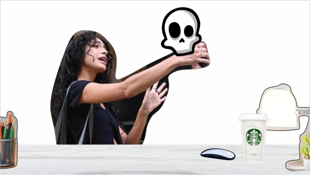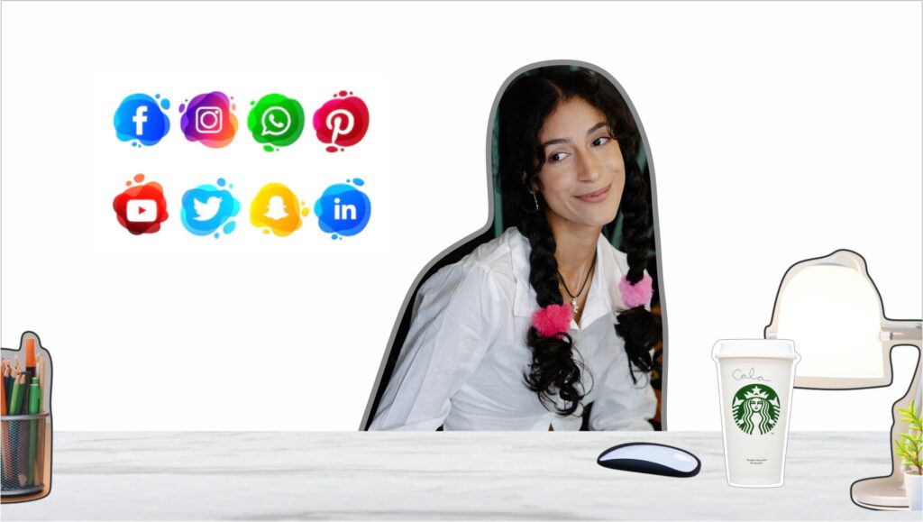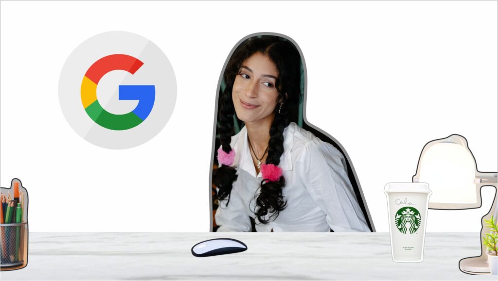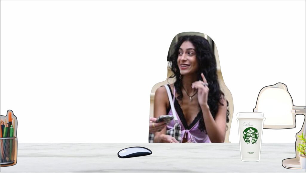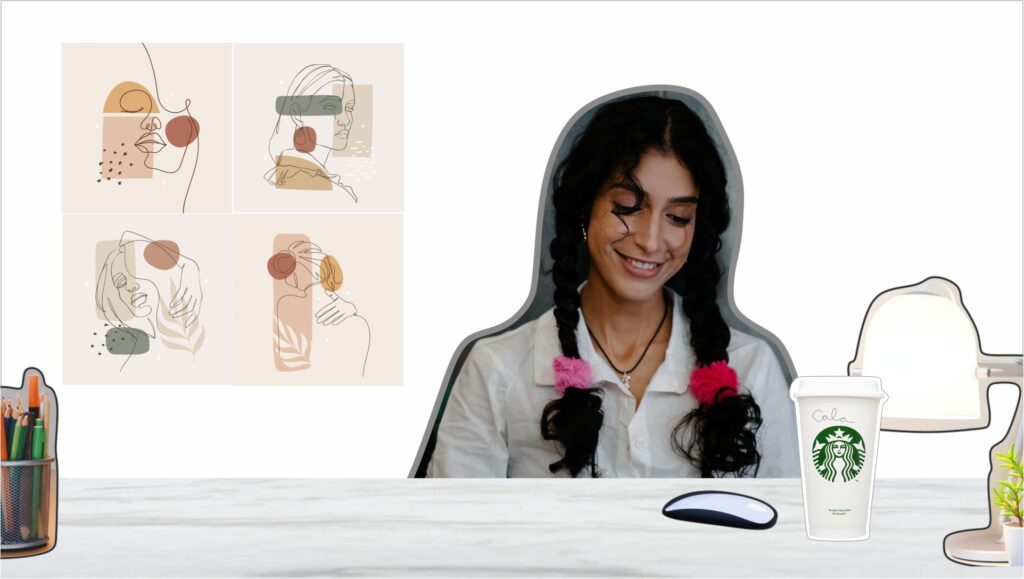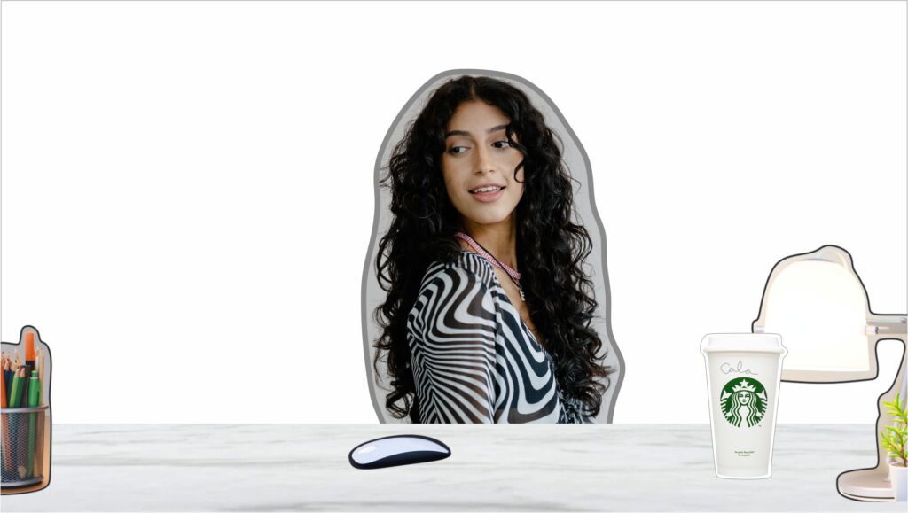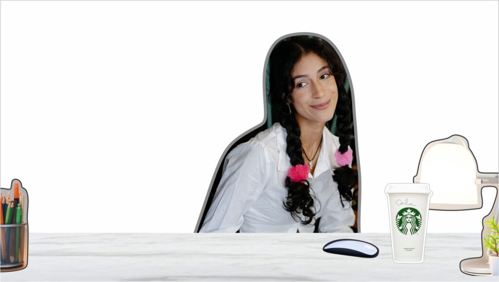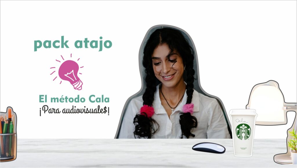 Plano pecho de CALA en su escritorio, tomada desde su computadora.